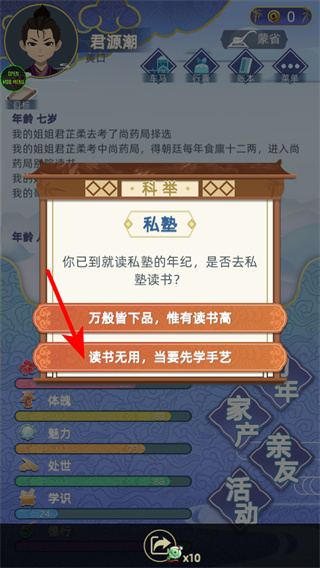 3、面对私塾就读选择时点击读书无用,当要先学手艺,发展选择是规划人生的关键环节,选择后走手艺发展路线,培养技能。