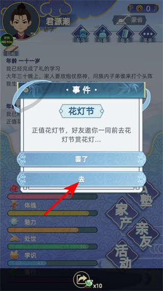 4、面对花灯节邀请时点击去,社交选择是拓展人脉的重要操作,选择后可参与花灯节活动,结识好友,发展积累社交的资源。