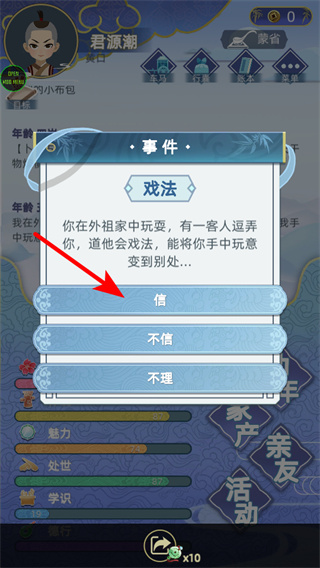 1、游戏页面面对戏法事件时点击信,选择操作是推动剧情的关键操作,选择后可触发后续戏法相关情节,丰富人生经历。