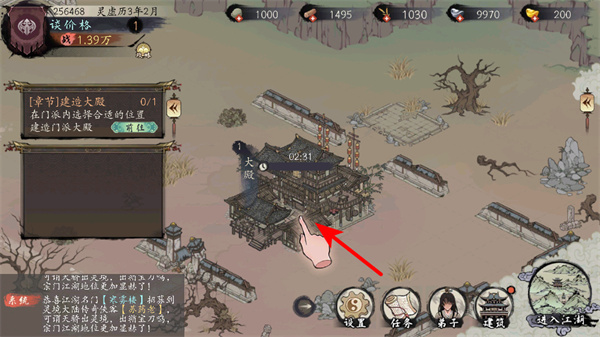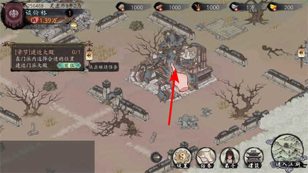 1、游戏中建造大殿时,需在门内选择合适位置进行建造,这是发展宗门的关键操作,建造时考虑宗门布局资源分配。