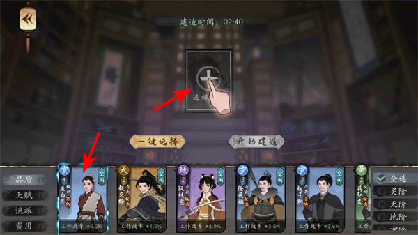 3、建造建筑时,选择合适的工匠如灵阶工匠并点击选择,可提升建造效率,选择时需结合工匠的工作效率的资质。