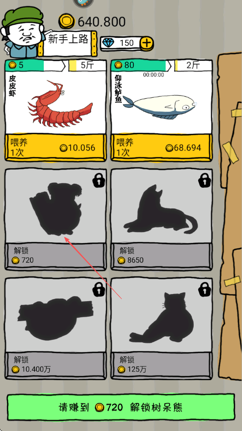 2、继续积攒金币当金币达到640.800时留意下方解锁动物提示努力赚取720金币解锁树呆熊。