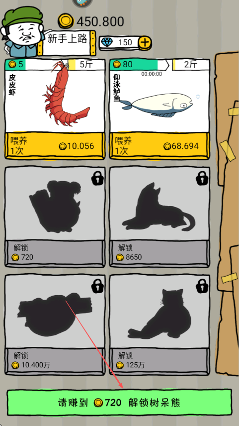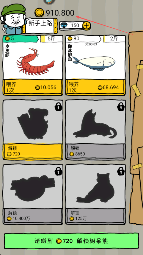 3、金币积累到910.800后可再次选择喂养已解锁动物或持续积攒为解锁更高级动物做准备。