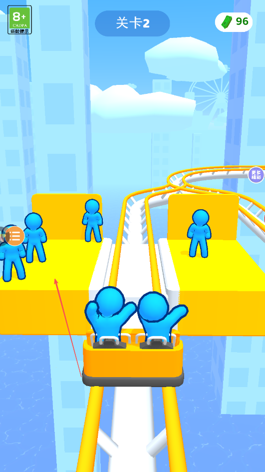 4、进入关卡2操控过山车靠近轨道旁小人搭载乘客并完成本关行驶目标。