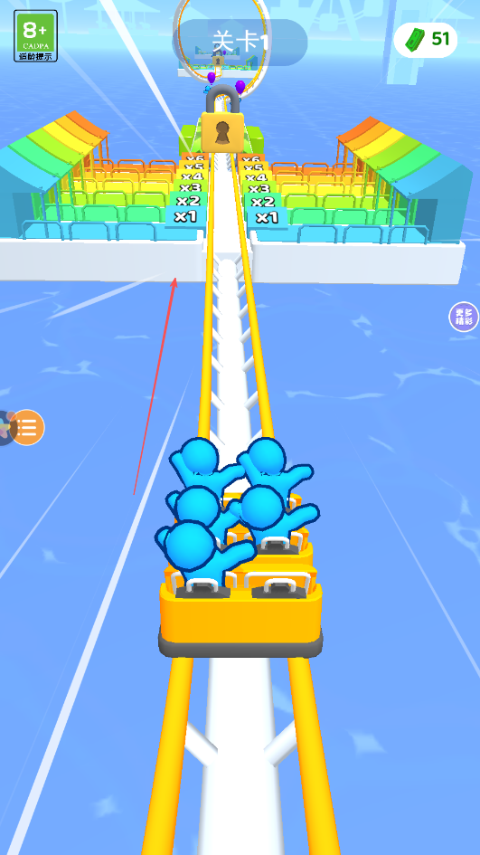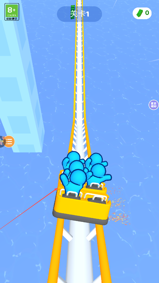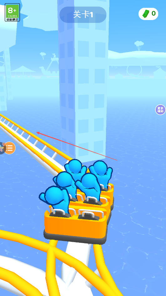 1、进入关卡1操控过山车沿轨道上行注意上方关卡1标识和右上角钞票数量收集沿途钞票。