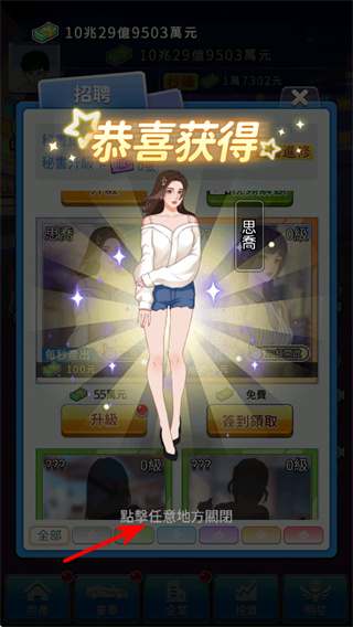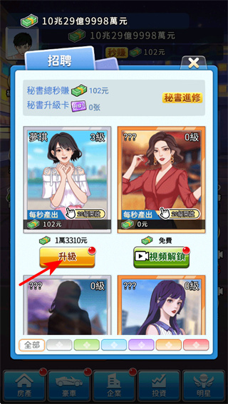 1、进入招聘界面后,点击秘书对应的升级按钮,票提升秘书等级,秘书等级越高每秒产出收益越多,提升收益关键操作。
