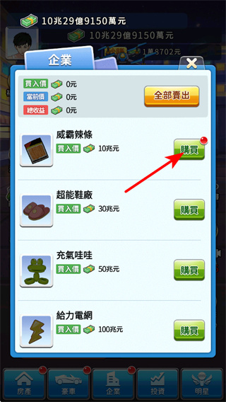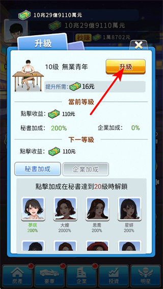 4、先通过升级角色和秘书积累足够资金,再点击企业界面的购买按钮解锁企业,带来长期收益增长,进步支撑后续升级需求。