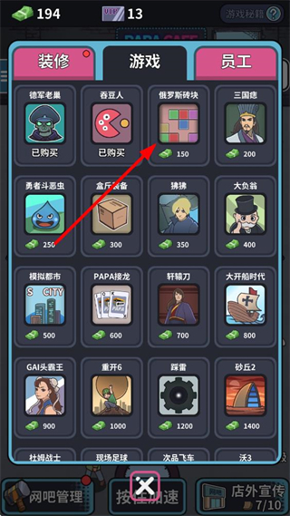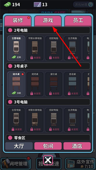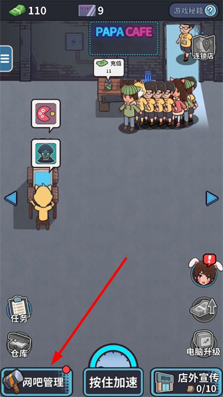 1、进入网吧模拟业主界面,找到下方的网吧管理按钮并点击,进入网吧管理操作。