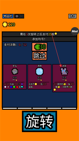 3、在添加符号界面中,可选择老鼠等符号,也可消耗资源点击跳过,利用符号辅助提升老虎机旋转后的金币收益。