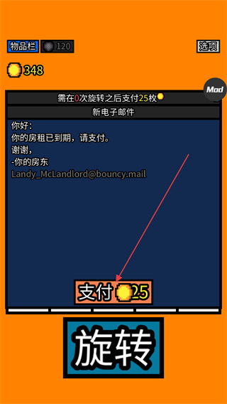 4、收到房租到期的新电子邮件后,点击界面中的支付25按钮,消耗25枚金币完成房租支付,继续后续的老虎机玩法流程。