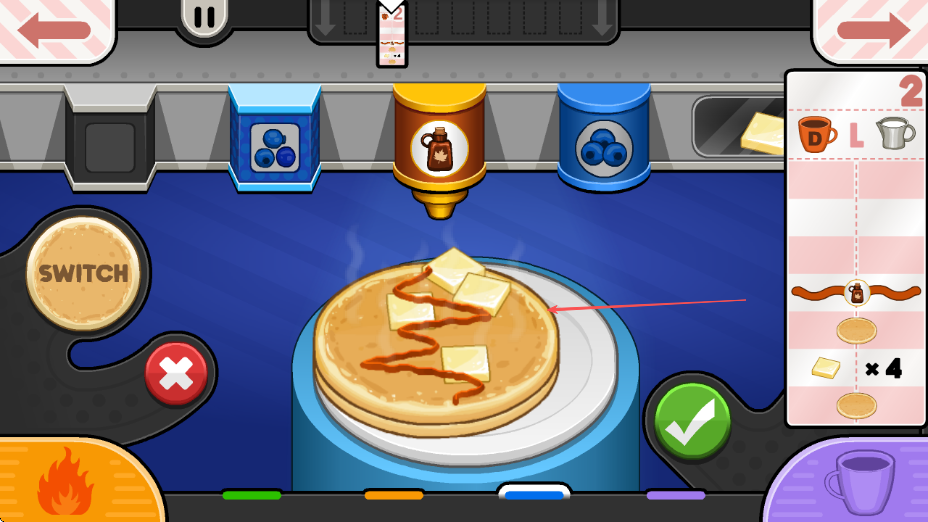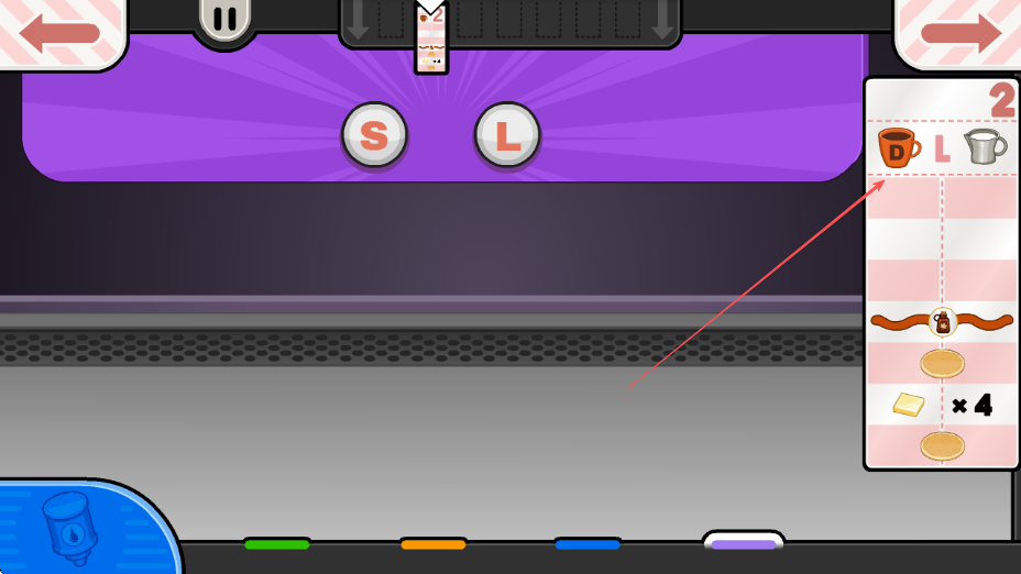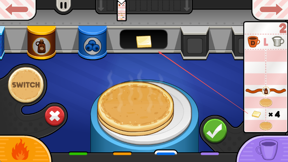 1、查看右侧订单栏明确所需配料数量如黄油需4块,滑动配料箱找到黄油准备添加。