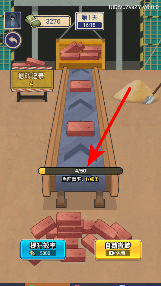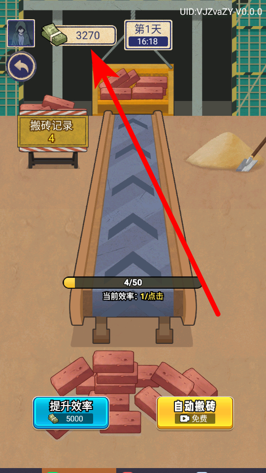 3、还能选择工地搬砖,需要完成指定的搬砖数量,通过点击等操作来推进进度,每完成一些就能积累收入不。