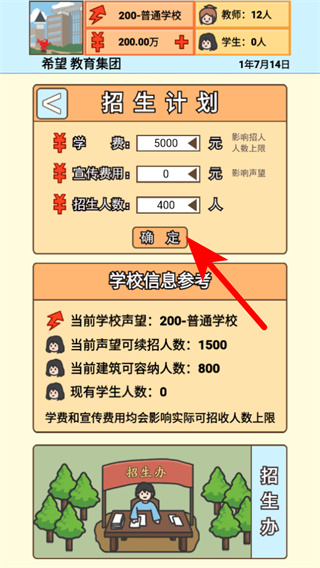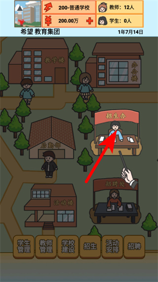 2、点击招生办区域,这是启动招生流程的基础操作,进入后可设置学费、宣传费用等招生参数,为学校吸纳学生做准备。
