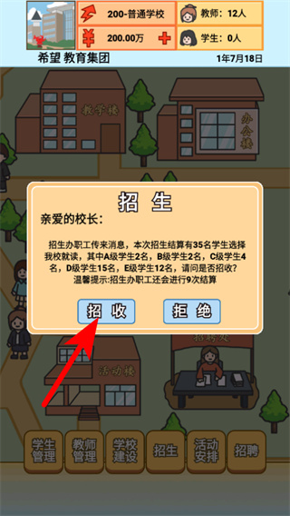 4、点击招收按钮确认录取学生,这是完成招生结算的重要操作,将该批次学生纳入学校,提升在校学生数量,推进运营进度。