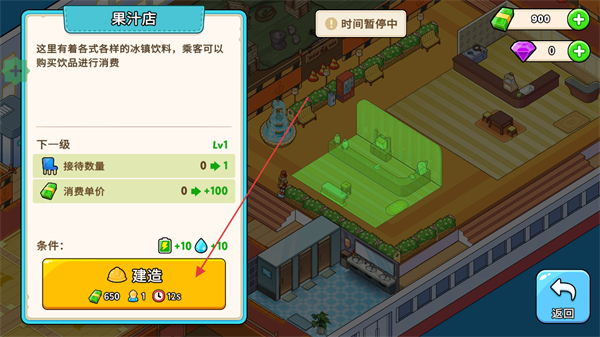 2、通过选择店铺的经营内容确定是否建造,建造需要达成一定的条件。