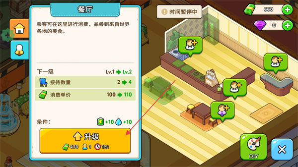 3、建设完餐厅后,可以点击餐厅内的设置进行升级,提高服务质量,或是招募员工。