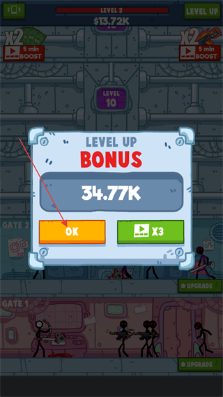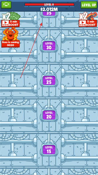 2、当游戏上方的经验值满后可以点击右上角的升级按钮,选择OK则可以消耗金钱进行升级解锁下面的楼层。