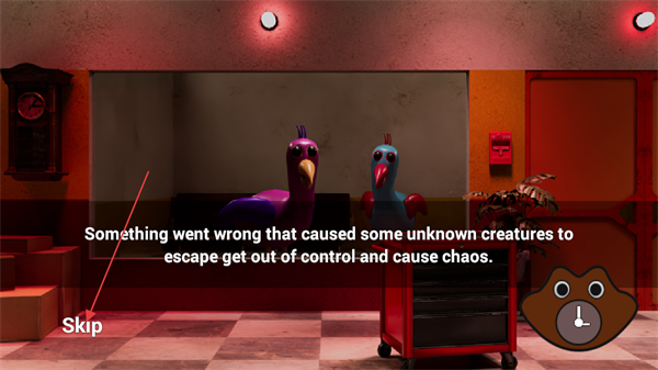 2、这是游戏的开场剧情界面,界面文字交代了未知生物失控逃脱并引发混乱的背景设定,点击左下角的Skip按钮可跳过这段剧情,直接进入游戏流程。