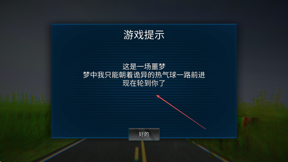1、进入游戏看到游戏提示界面,了解到这是一场噩梦需朝着诡异热气球前进,点击好的按钮进入游戏。
