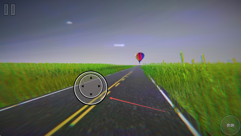 2、进入游戏场景,通过操控屏幕中的方向控制键调整前进方向,朝着远处的热气球行进。