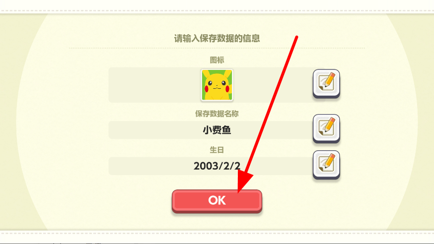 1、进入时需输入保存数据的信息,像图标、保存数据名称、生日等,设置好后点击OK,即可开启和宝可梦伙伴的冒险之旅,为后续互动做好准备。