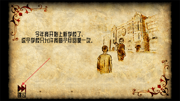 2、在出现文字剧情的界面,点击左下角的跳过按钮,可快速略过这段剧情介绍进入后续内容。