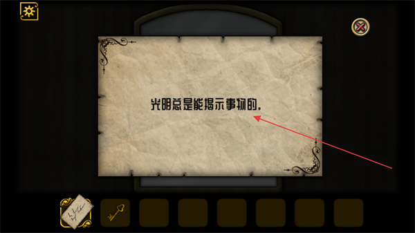 4、点击纸张可以看到光明总是能揭示事物的这段提示后,需留意游戏中与光明相关的元素,利用这类元素去探索隐藏的线索来推进游戏。