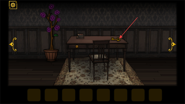 3、在当前的房间场景中,找到桌子上的钥匙道具并点击拾取,该道具后续可用于开启对应锁具以推进游戏进程。