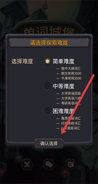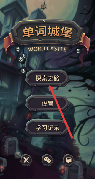 1、打开单词城堡,在主界面点击“探索之路”选项,进入难度选择的弹窗界面。