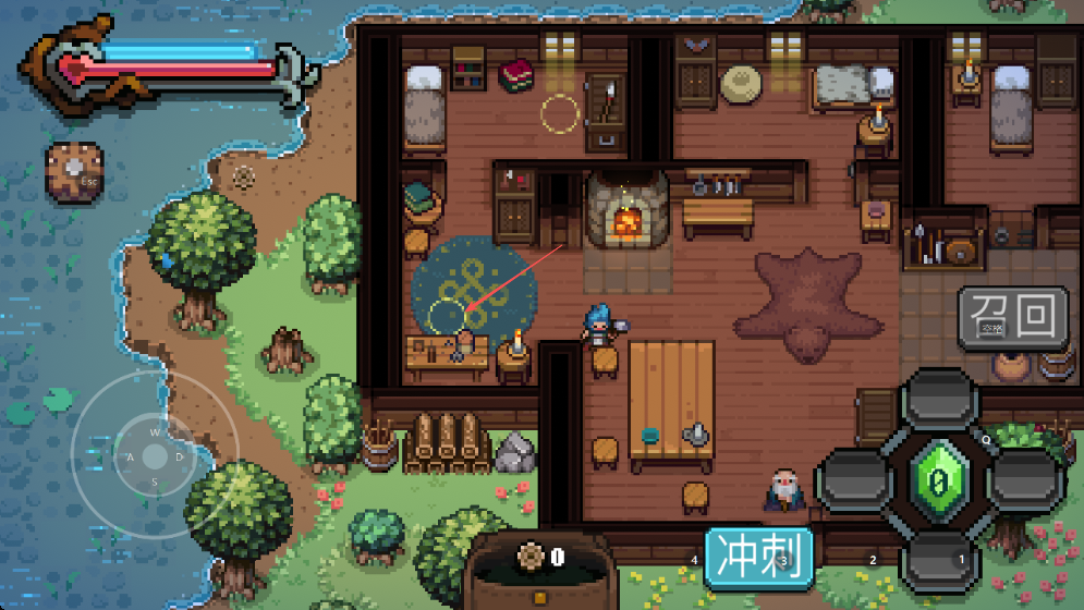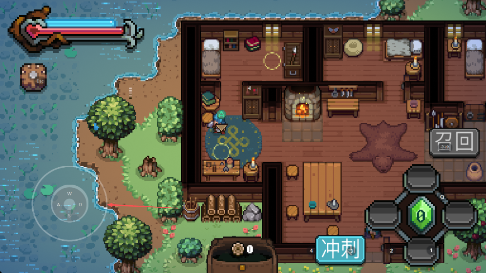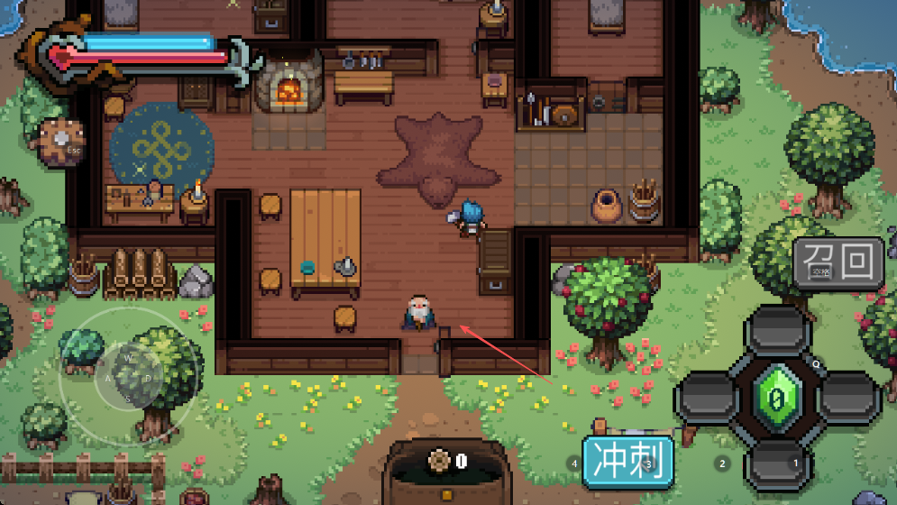 2、进入房屋区域,利用左下角方向键走位,熟悉冲刺等技能按钮位置。