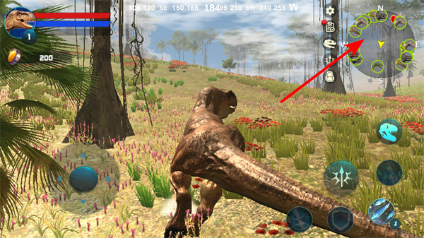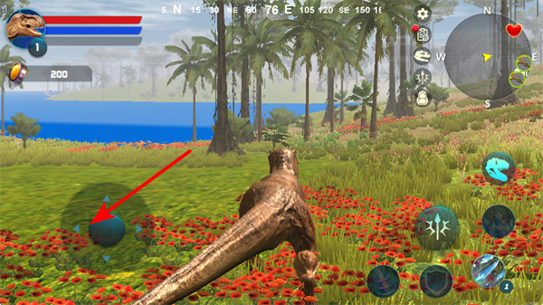 3、通过左侧虚拟摇杆操控恐龙移动,移动操作是恐龙在场景中探索、觅食战斗基础,穿梭于恐龙世界。
