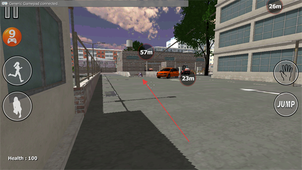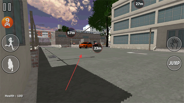 1、观察场景中的距离标识,操控角色向目标区域如橙色车辆移动。