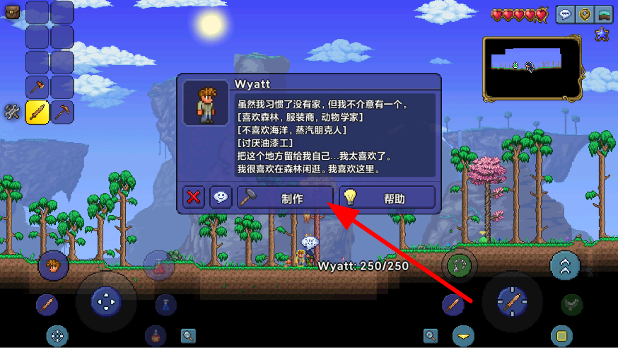 4、与NPC互动时,可根据需求选择制作或帮助等选项,通过制作获取所需物品,借助帮助解决遇到的问题,更好地在泰拉瑞亚世界冒险。