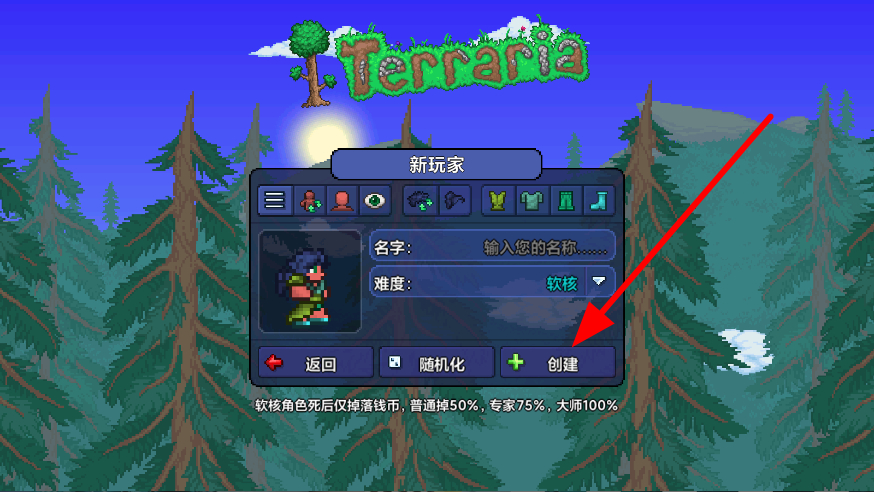 1、进入角色创建界面,输入角色名称,选择合适的难度,像软核难度,角色死后仅掉落钱币,之后点击创建,即可生成角色开启冒险。