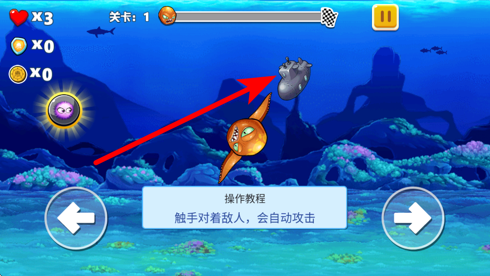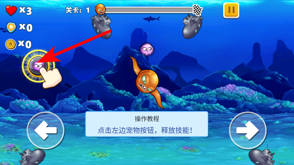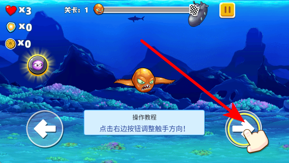 1、在游戏界面,点击右边的按钮,可调整海洋生物触手的方向,让触手朝向敌人,为攻击敌人潜艇做好准备。