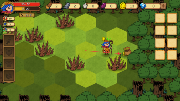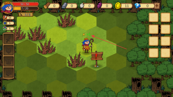 1、进入游戏查看屏幕上方血量值50/50及各类资源计数,操控角色在六边形地格场景中移动。