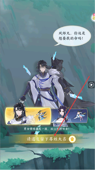 2、在角色选择界面,可看到角色之间的对话,且提示男女修炼强度一致,选好角色后填写名称后即可进入游戏。