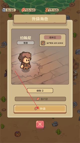 4、点击右下角查看角色信息,花费食物可以升级角色等级提高生产量。