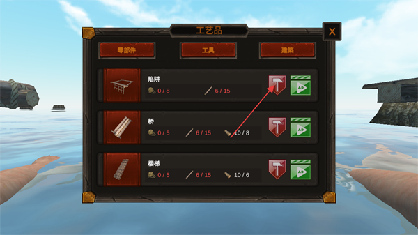 3、切换到工艺品的建筑标签页,查看陷阱的材料条件,待材料充足后点击对应按钮制作建筑类物品。