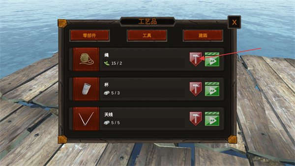 2、在工艺品的零部件标签页,查看绳等物品的材料需求,当材料满足对应要求时点击按钮完成制作,这是建造建筑的基础部件。