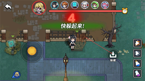 1、操控角色点击躲藏,寻找场景中的掩体隐藏自身,躲避追捕者。