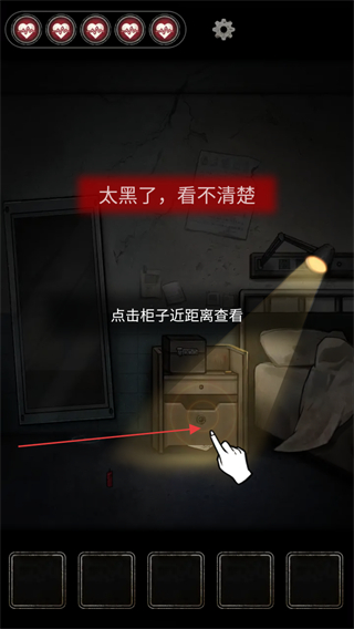 2、在该场景中看到太黑了,看不清楚的提示后,按照指引点击房间内的柜子,进入柜子的近距离查看界面,以便探索柜子相关的解谜线索。