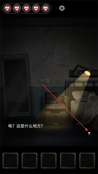 1、进入该昏暗房间场景后,点击下方对话框的箭头标志,推进当前场景的剧情流程,同时留意房间内的可交互物品。