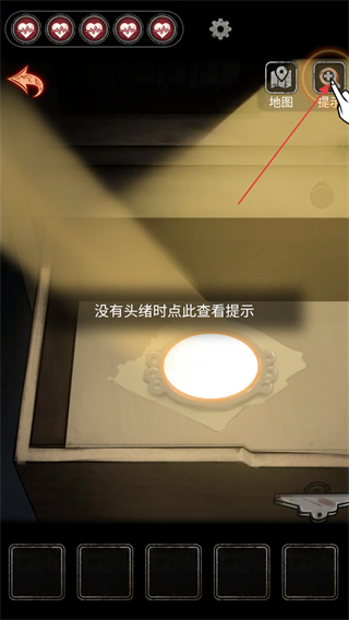 4、在解谜探索过程中若没有头绪,可点击界面右上角的提示按钮,获取当前场景的解谜指引,同时也可通过地图按钮查看场景布局。