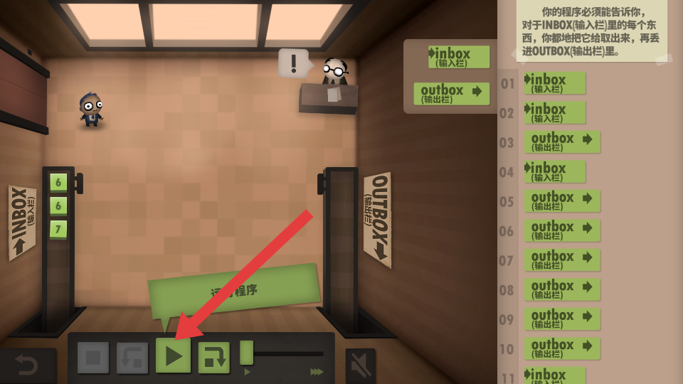 4、点击箭头指向的运行按键绿色三角形,执行编写好的程序,测试程序是否能正确处理INBOX输入栏。