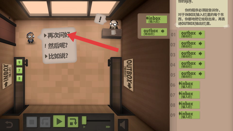 3、点击箭头指向的再次问好选项,与游戏内角色互动,获取编程提示或推进剧情,明确后续编程任务。