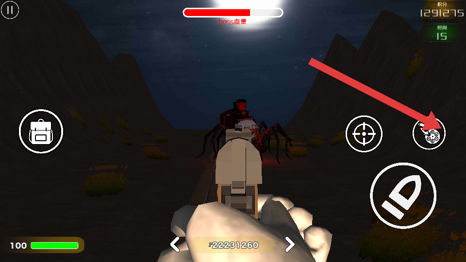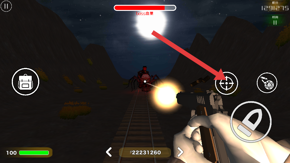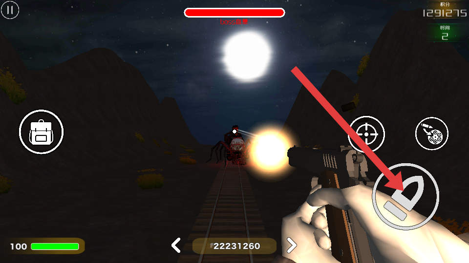 2、进入月夜山间铁轨的BOSS战斗场景后,按键控制角色在铁轨两侧移动,避开BOSS的攻击范围,点击射击用装备的武器向BOSS发起攻击。
