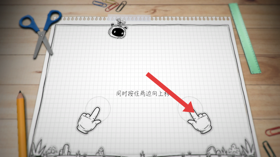 1、按照提示,同时需要按住箭头指向的右侧手部标识区域,并向上移动,操控游戏角色小机器人移动。