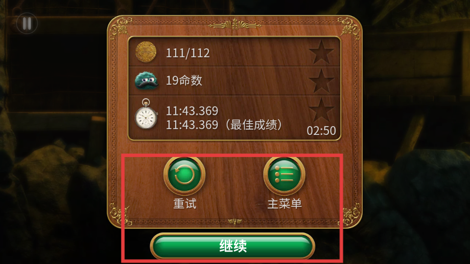 4、关卡结束后,会显示金币收集数、命数、时间成绩等信息,可选择重试、主菜单或点击继续推进游戏。