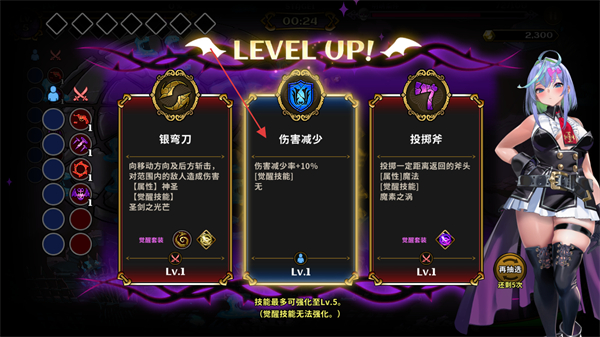 4、角色升级触发技能选择界面后,可选择伤害减少等技能,提升角色能力以增强后续战斗的实力。